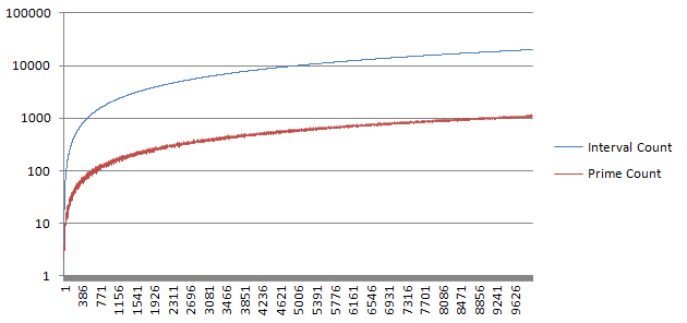 Repeating this for every interval produces a picture-perfect primes-per-interval curve.