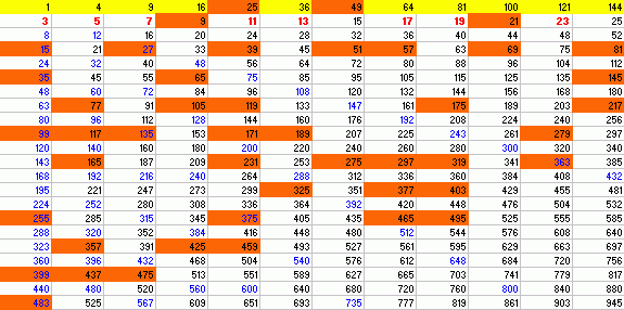 However, it does seem likely that only a discrete subset of perfect square additions have the potential to yield the desired result. This is illustrated in the following section of a matrix generated using the code disclosed in the previous column. The composites of nonadjacent perfect squares have been highlighted in orange. This is what it looks like when the table has 250 columns (or minus squares) - merely the first 250 odd numbers.