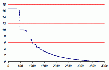 There is reason to believe that N / ~6 must have some significance. Of all the odd composites under 10,000, 449 out of 3747 have ratios in the 16th percentile. The next largest group are 289 that have have ratios in the 9th percentile. Only 18 composites lie between these two percentiles. All other composites, about 80%, have ratios less than 9%. If you graph it (and you can do this with the downloadable data on these composites), it looks like this: