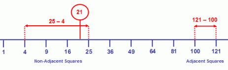 Thus, for 21, the square roots of the nonadjacent squares are sqr(4) = 2 and sqr(25) = 5.